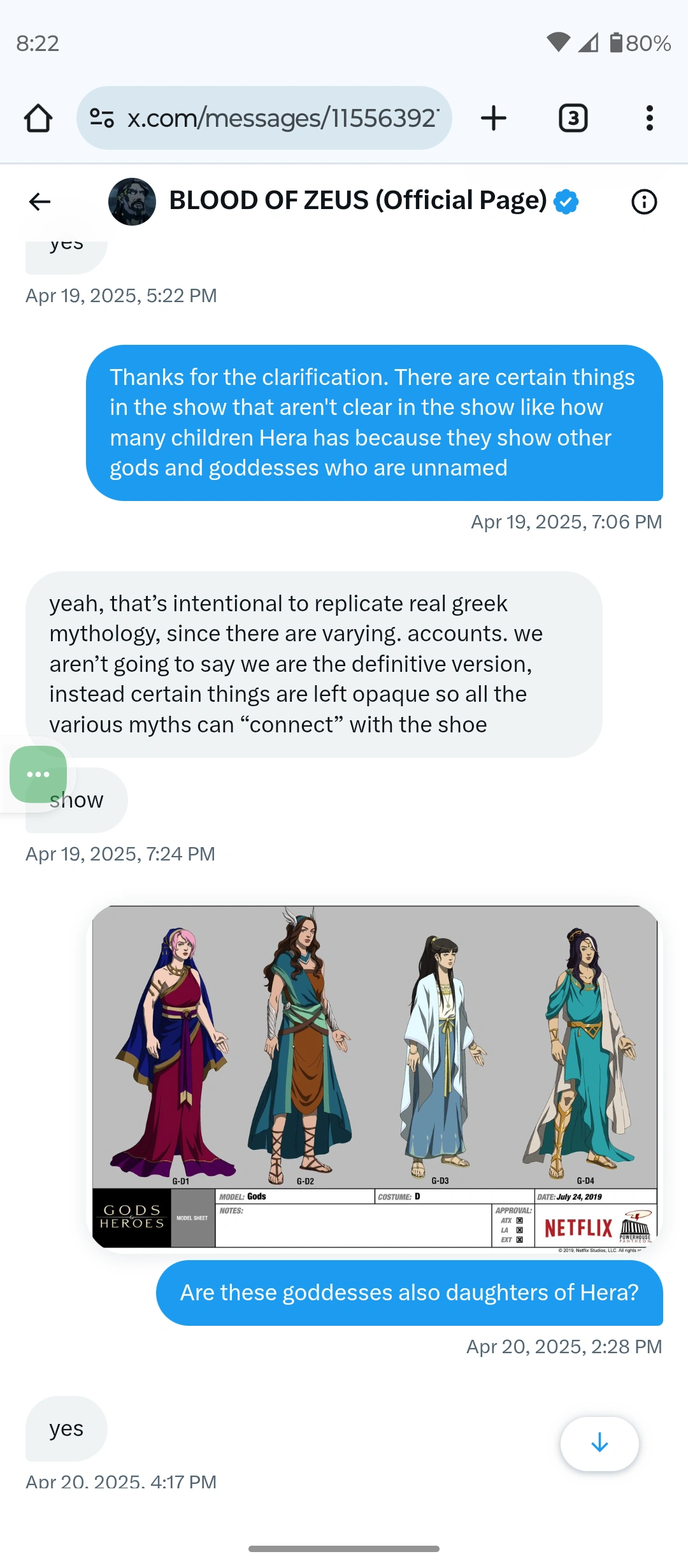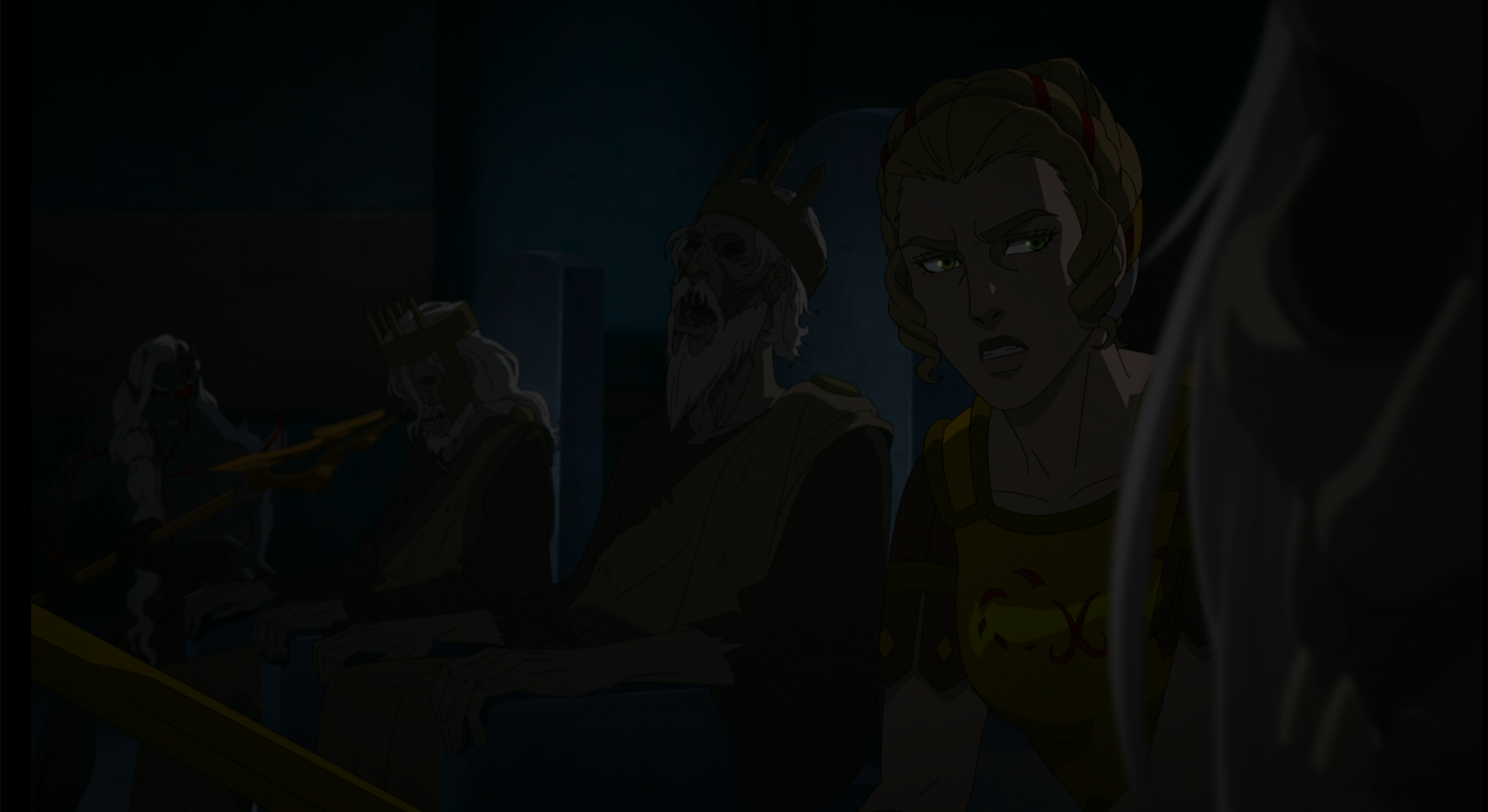 Powerhouse Animation (@PowerhouseAnimation) on Twitter "We are going to pause the episode here just so we can spend a few minutes staring at the gods and goddesses lineup. And if we are talking about gods and goddesses, we have to talk about @joyhua, who is responsible for a lot of these beautiful beings 😍 #BloodofZeus" (screenshot)